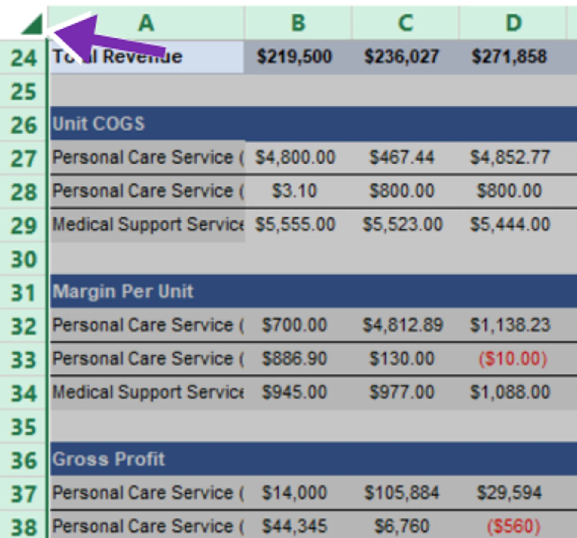1. Navigate to the Select All button and select it. The button is found at the top-left corner of the sheet where the row numbers and column letters intersect.